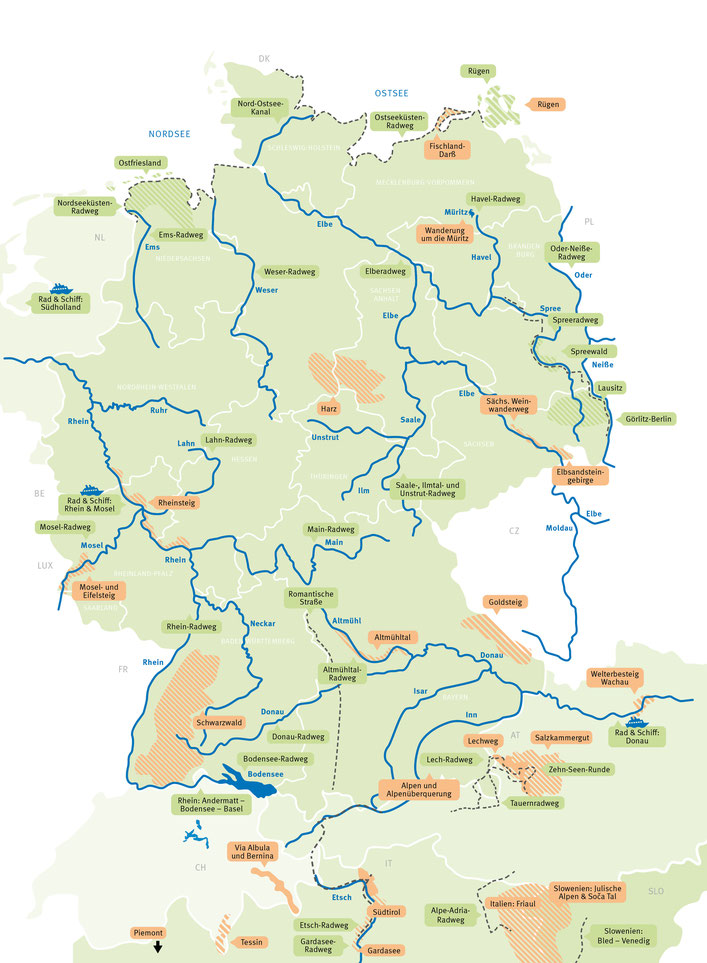 Legende: Grün = Radreisen | Orange = Wanderreisen